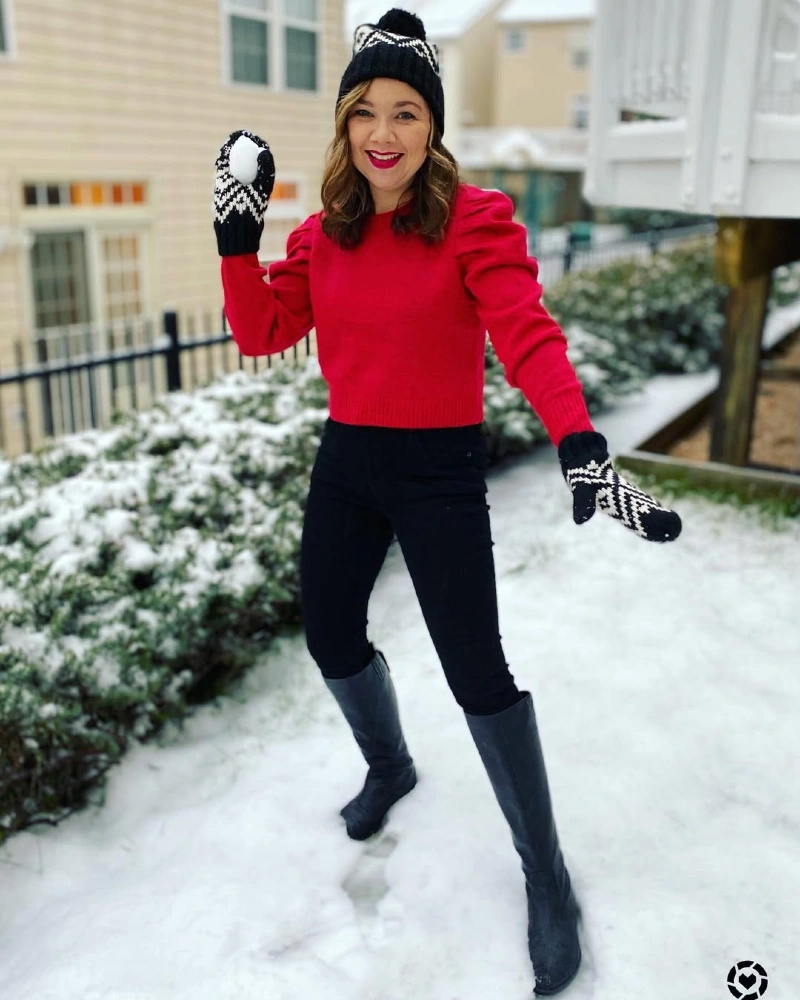 The textures in this ensemble command attention, proving that a red sweater can anchor even the most dramatic of winter looks.
