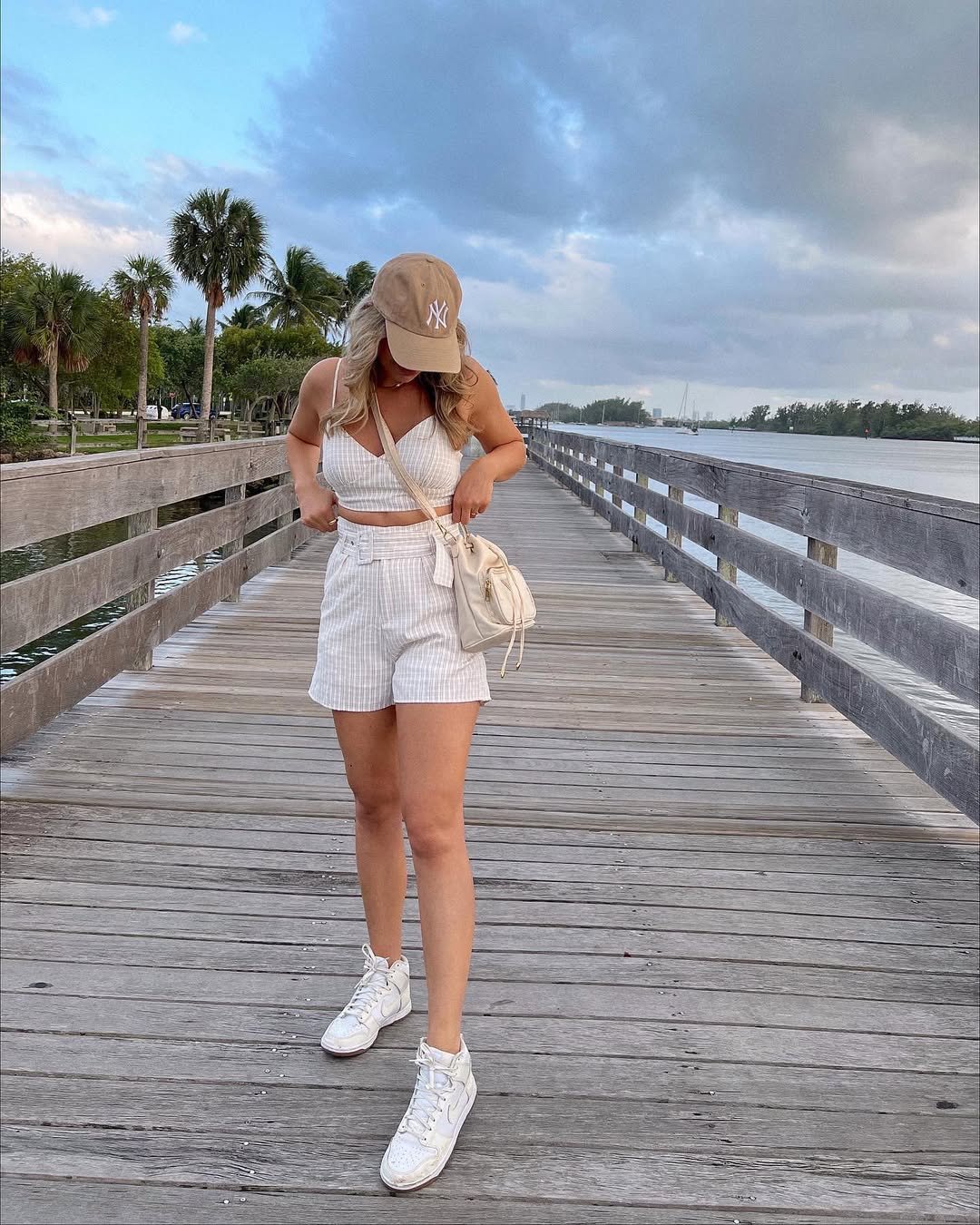 This neutral striped set feels perfectly suited for sunset strolls near the water. The combination of a cropped cami and high-waisted shorts maintains a balanced silhouette, while sneakers and a cap add a relaxed, coastal touch.