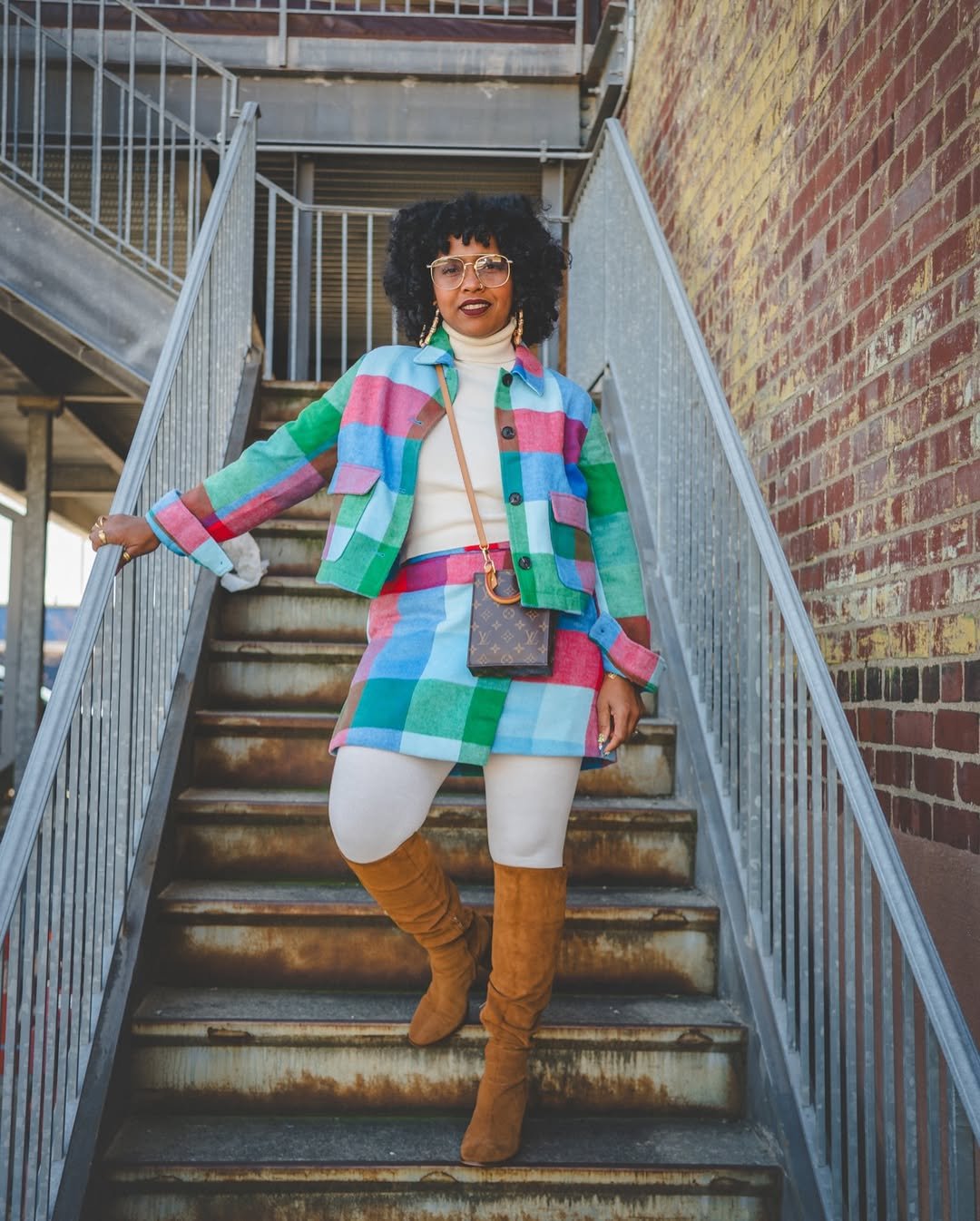 A vibrant plaid jacket and skirt set, layered over a neutral foundation, exudes a strong sense of personal style. The vivid colors stand out against the brick backdrop, and the coordinated pattern unifies the look with a bold statement.