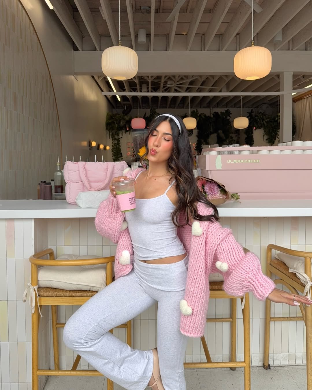 A soft gray lounge set complemented by a chunky pink cardigan embodies the beloved cozy-girl aesthetic. The fitted tank and flared pants serve as a sleek foundation, allowing the vibrant knit to capture attention.
