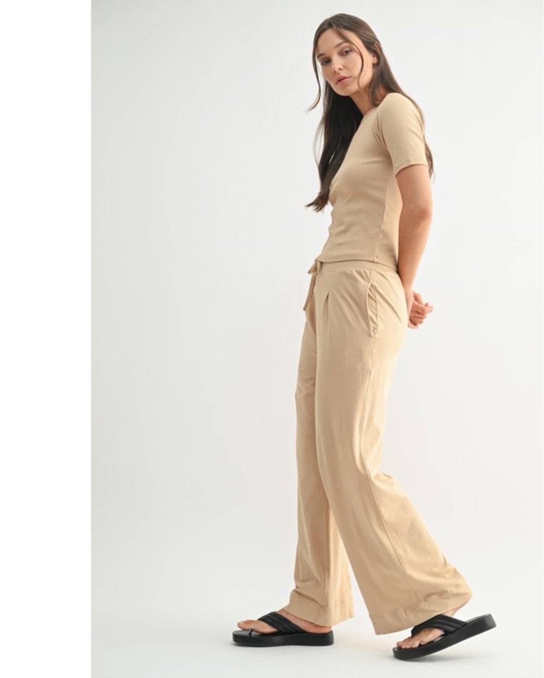 A monochrome beige set might seem simple, but its impeccable fit elevates it significantly. The soft tee and wide-leg pants drape beautifully, creating a silhouette that is both modern and clean.