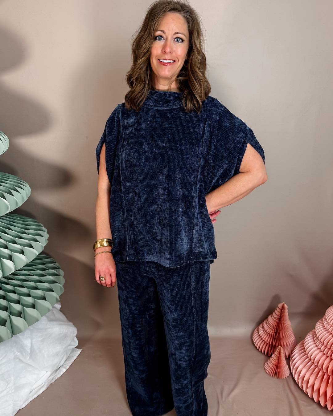 This deep navy textured set introduces a sense of richness without being overly ostentatious. The relaxed top and coordinating wide-leg pants create an elevated loungewear aesthetic, perfect for when comfort is desired but style is non-negotiable.