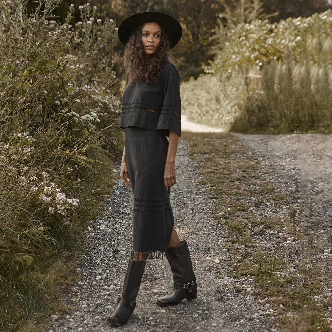 A cropped black top paired with a midi skirt, styled with tall boots and a wide-brim hat, offers a cinematic appeal. The silhouette possesses a certain softness, yet the monochromatic palette anchors it with strength and sophistication.