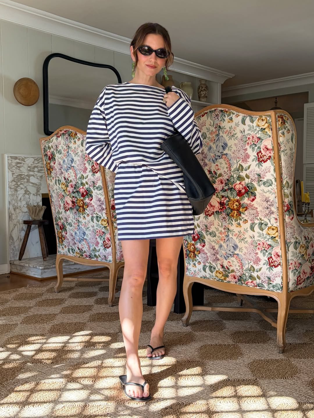 A relaxed striped top paired with a matching mini skirt embodies an understated, effortless appeal. The loose silhouette, complemented by sleek sunglasses and a minimalist black shoulder bag, perfectly captures that coveted off-duty French style.
