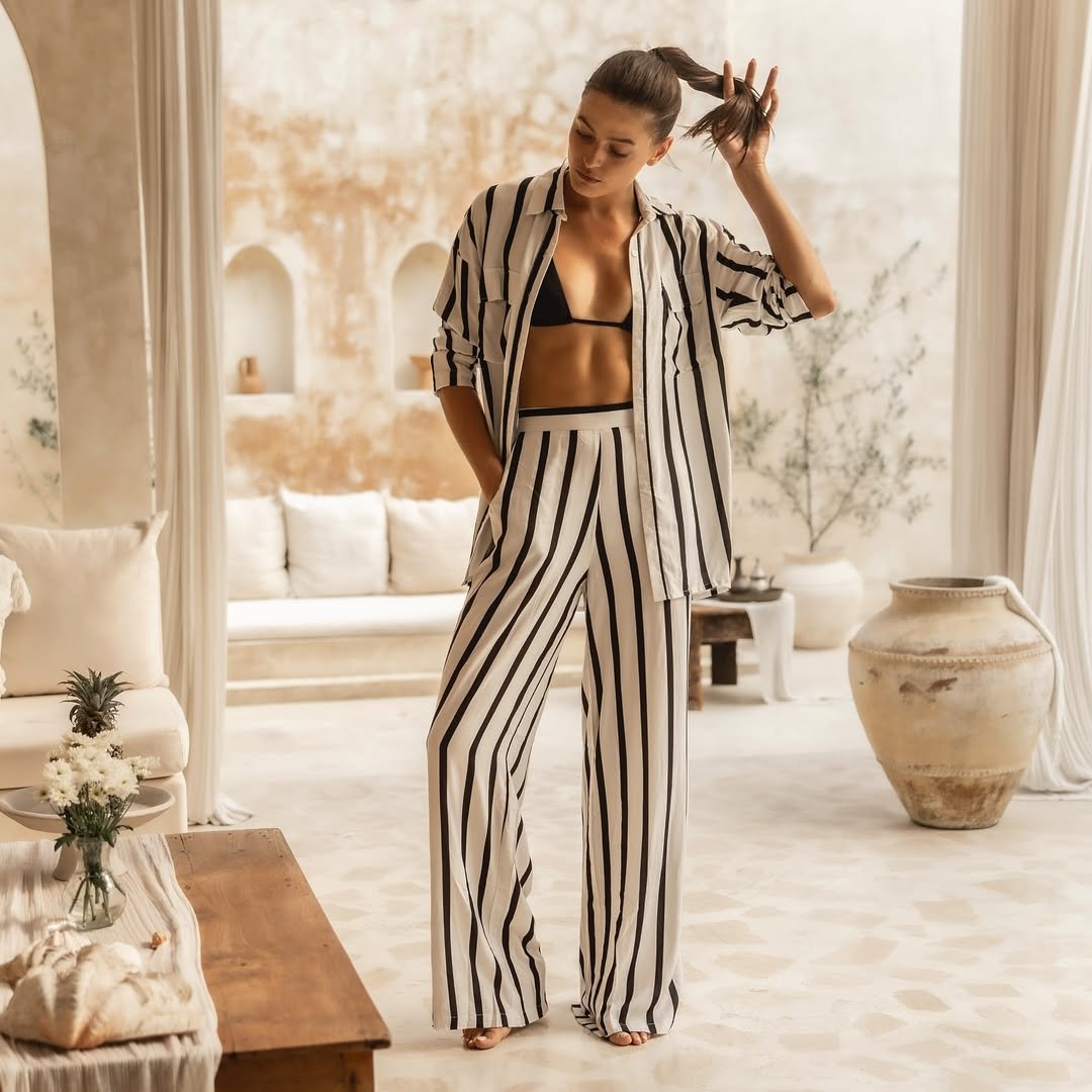 Wide-leg pants featuring vertical stripes paired with a coordinating button-down shirt evoke the ambiance of a sun-drenched villa. The fluid fabric and the open shirt layered over a bikini top create a look that is both relaxed and refined.