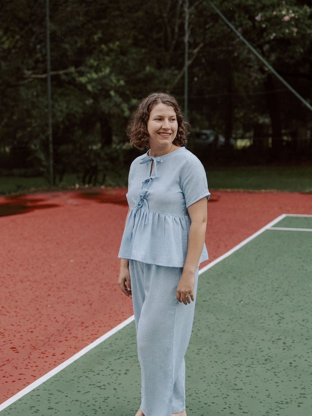 This pale blue linen set prioritizes understated comfort. The tie-neck top adds a delicate detail, and the relaxed pants contribute to a breathable, easy-to-wear feel, as if you’re effortlessly gliding through your day.