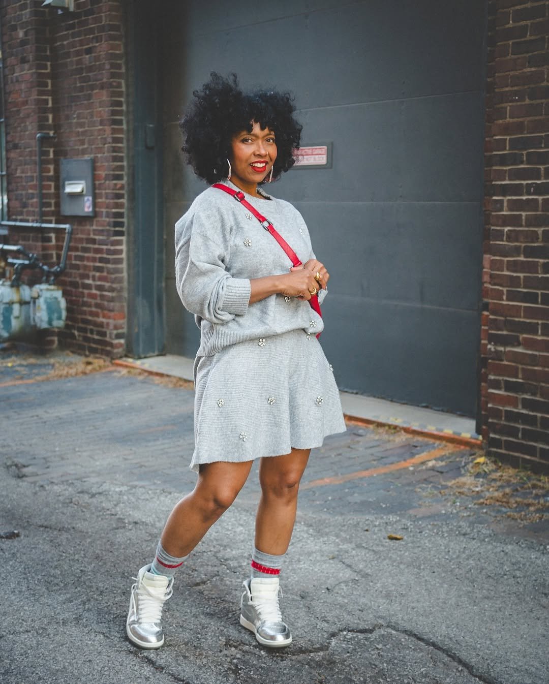A grey embellished knit set paired with high-top sneakers masterfully blends comfort with a cool aesthetic. The matching skirt and sweater offer a polished base, while the athletic-inspired footwear adds a playful touch.