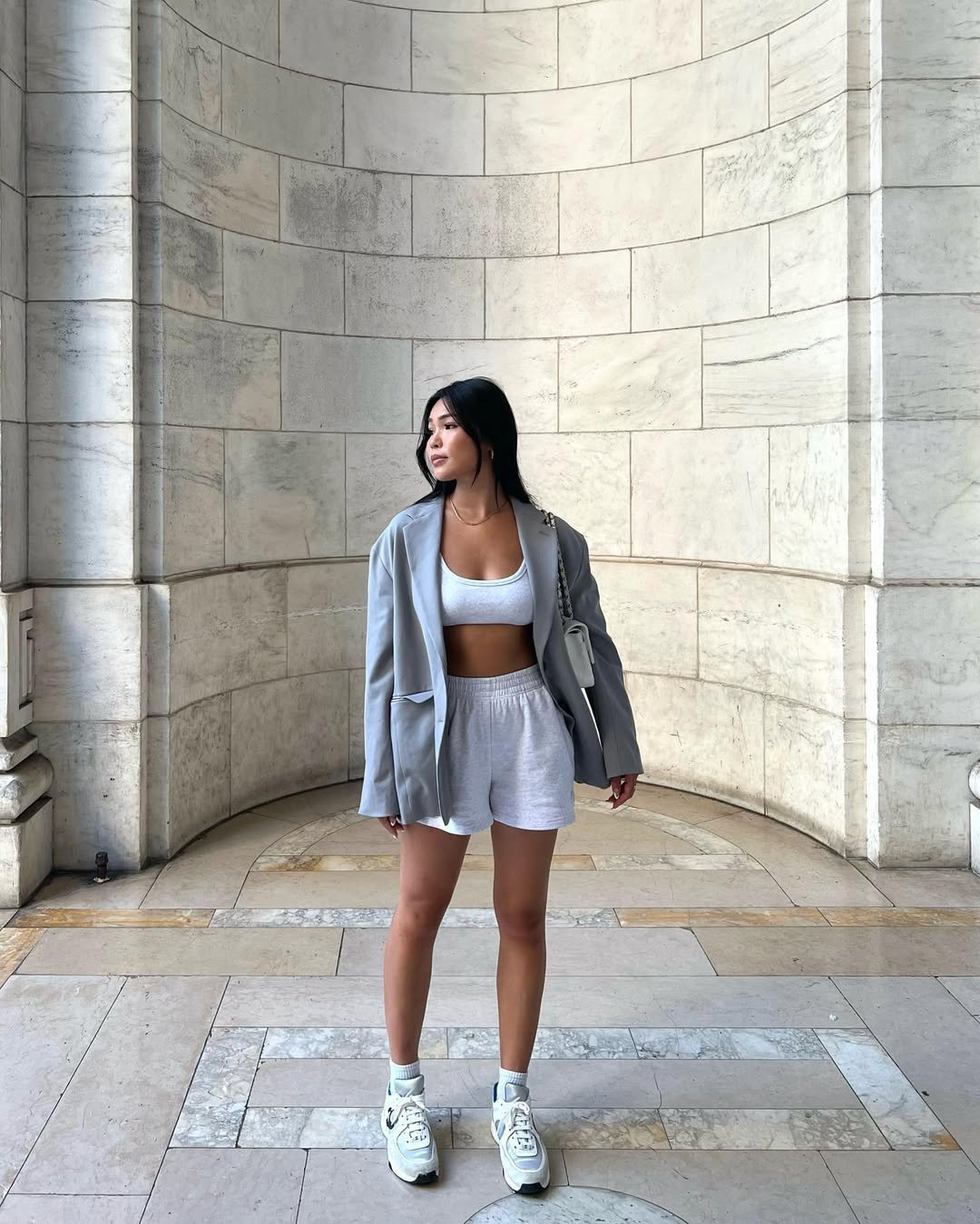 Combining an oversized blazer with a sports bra and shorts creates a striking high-low contrast that is always effective. The sharp lines of the grey blazer refine the casual base, while chunky sneakers add a grounded, cool-girl vibe.