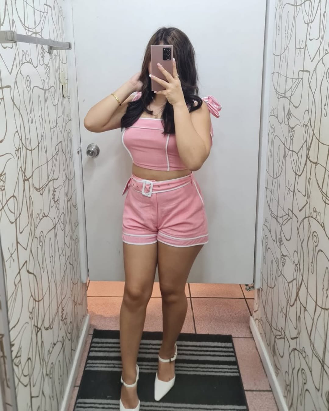 This bubblegum pink set radiates playful confidence with a touch of sass. Featuring contrast piping, a matching belt, and a structured crop top, it achieves a coordinated look with a fun and flirty edge. Paired with white heels, it commands attention.