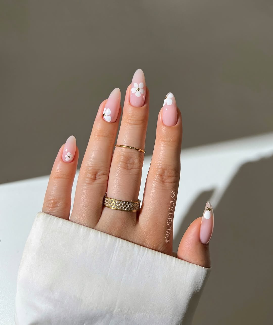 Muted pink almond nails are adorned with delicate white floral accents, creating an effortlessly elegant and refined look. The airy placement of the art prevents it from feeling cluttered.