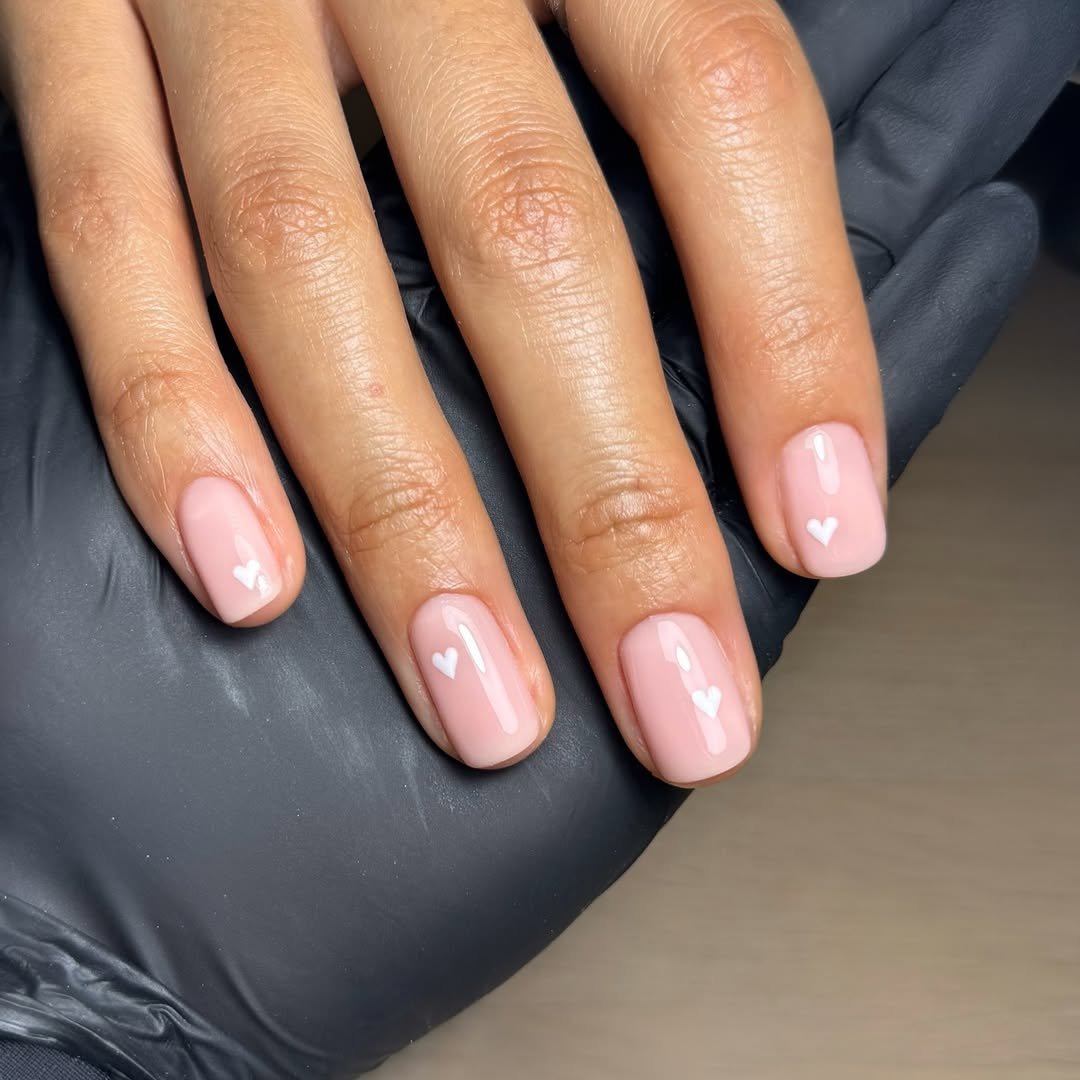 Short, glossy blush nails scattered with tiny white hearts are remarkably simple and charming. The key to their appeal is the spacing, ensuring a look that feels natural and unforced.