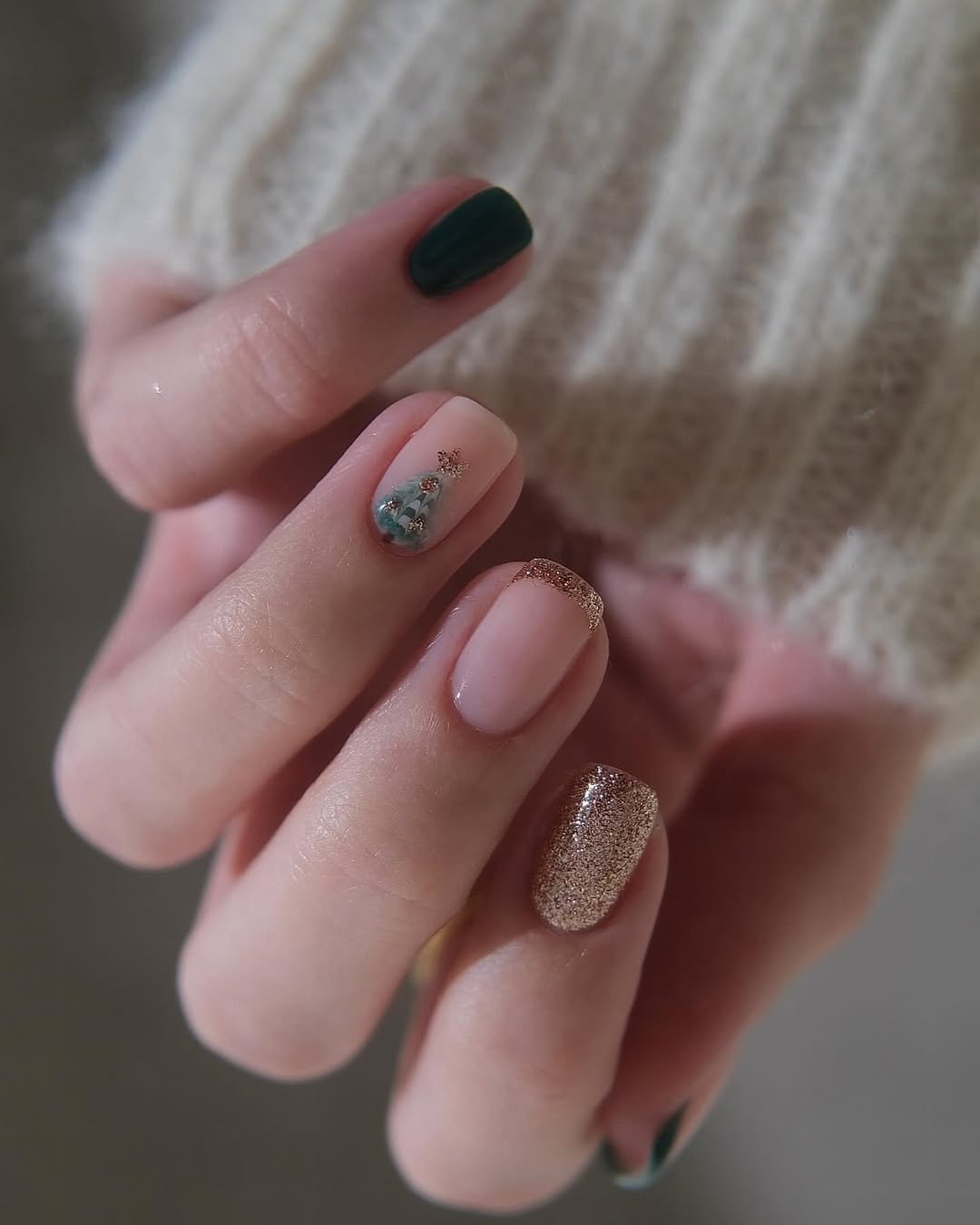 A subtle blend of muted pink with deep forest green and a touch of gold shimmer creates a manicure with understated personality. A small, elegant tree motif adds a festive note without being overwhelming.