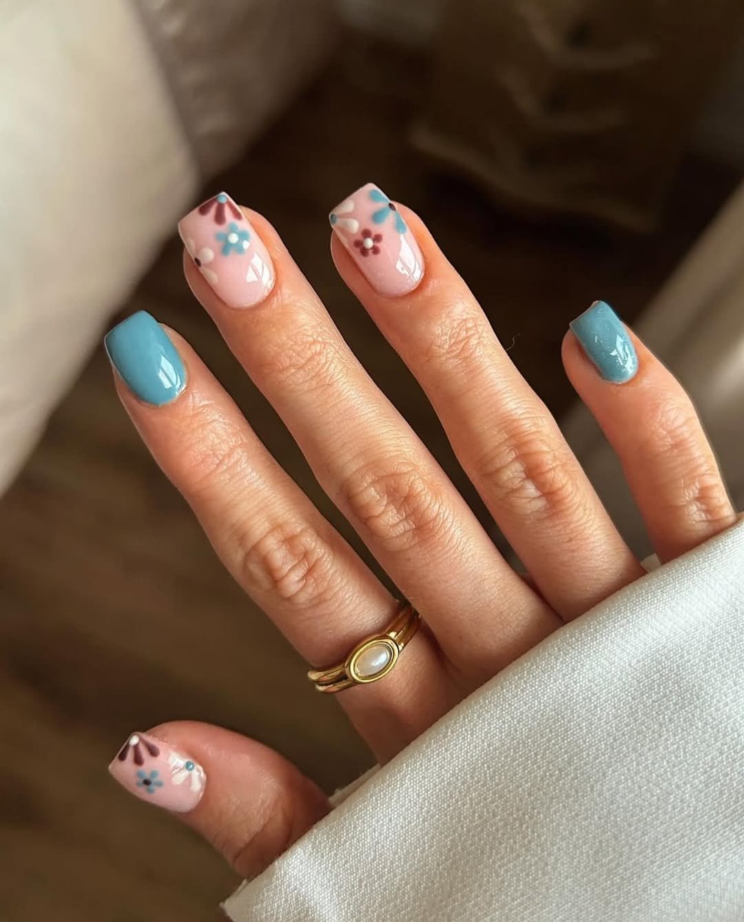 A glossy pink base is enhanced with small, sparingly placed floral designs, paired with solid blue nails. This arrangement ensures the look is lively yet harmoniously balanced, with ample visual breathing room for each element.
