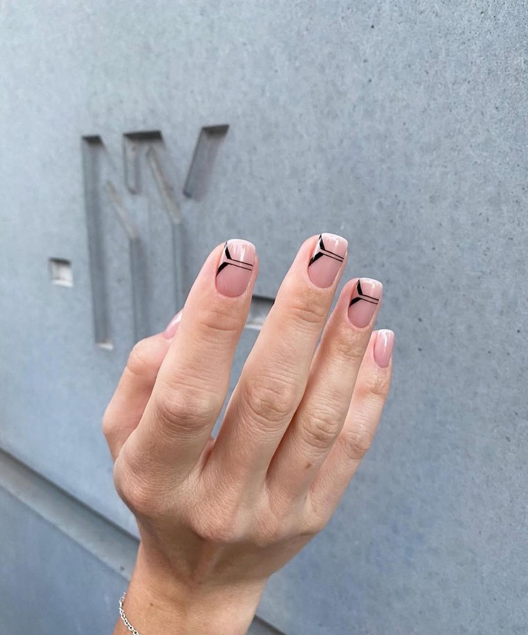 A polished nude base adorned with sharp, angular black lines creates a look that is minimal yet possesses an architectural quality. The use of negative space and precise striping lends it a sophisticated, editorial feel.