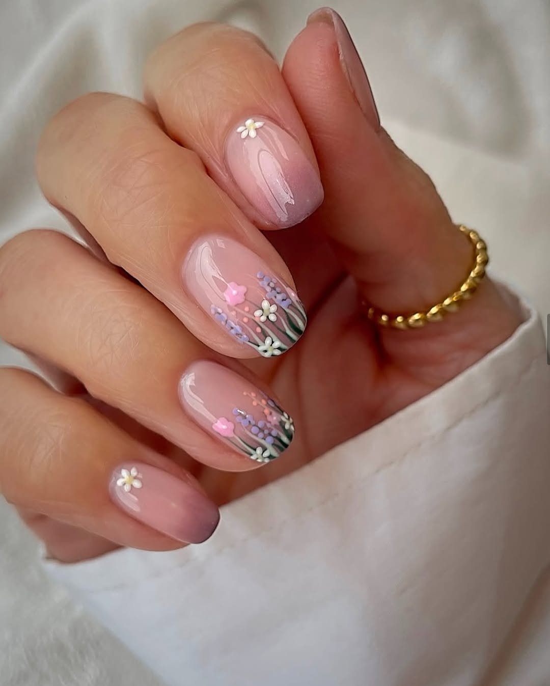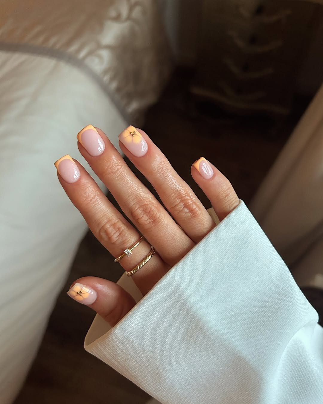 The square nail shape combined with peach-toned French tips brings warmth to the look, further enhanced by tiny gold-centered florals. This creates a sun-kissed effect that feels effortlessly pretty.
