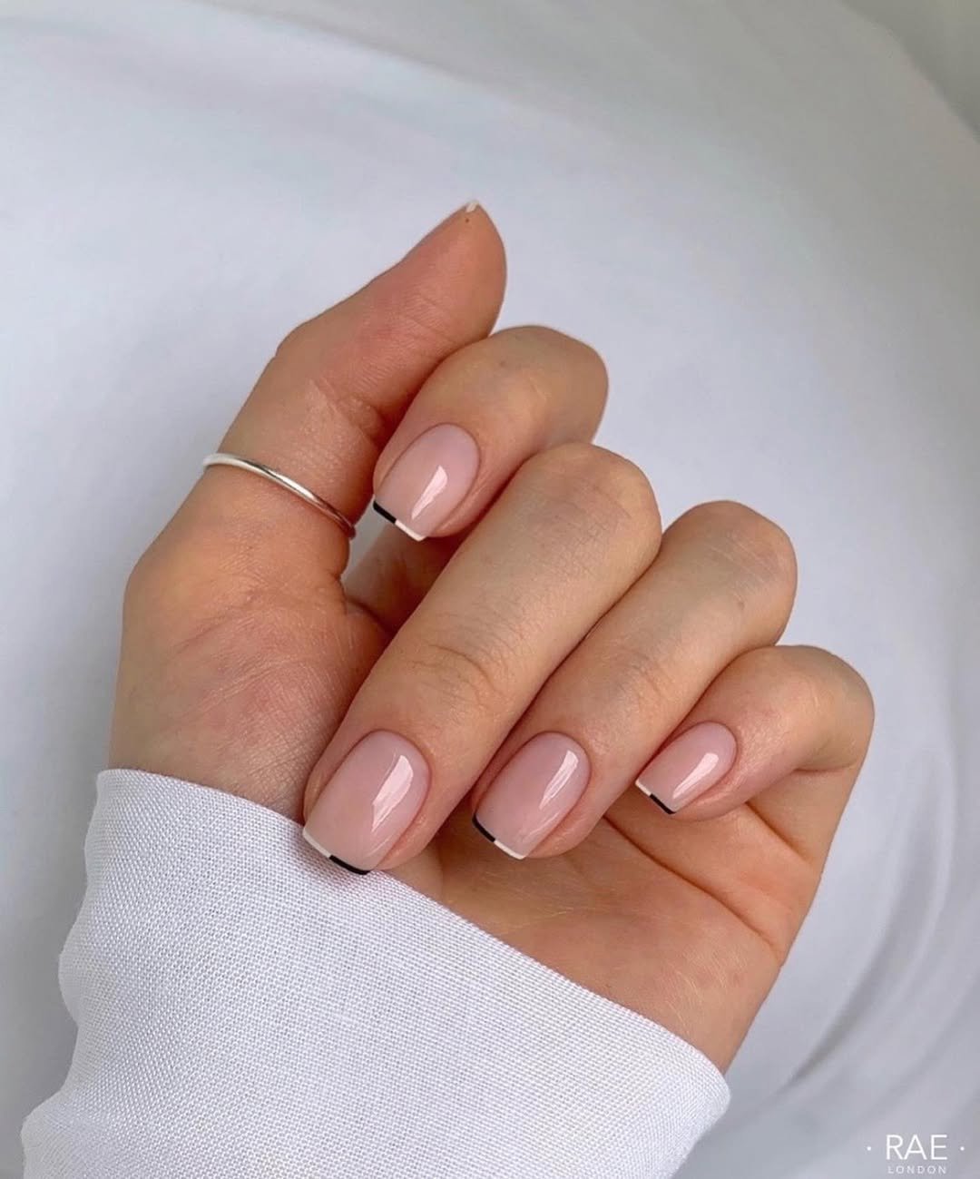 Short, nude nails accented with the most delicate black tips exemplify how minor details can make a significant impact. This offers a contemporary interpretation of the classic French manicure, pared down to its most elegant form.