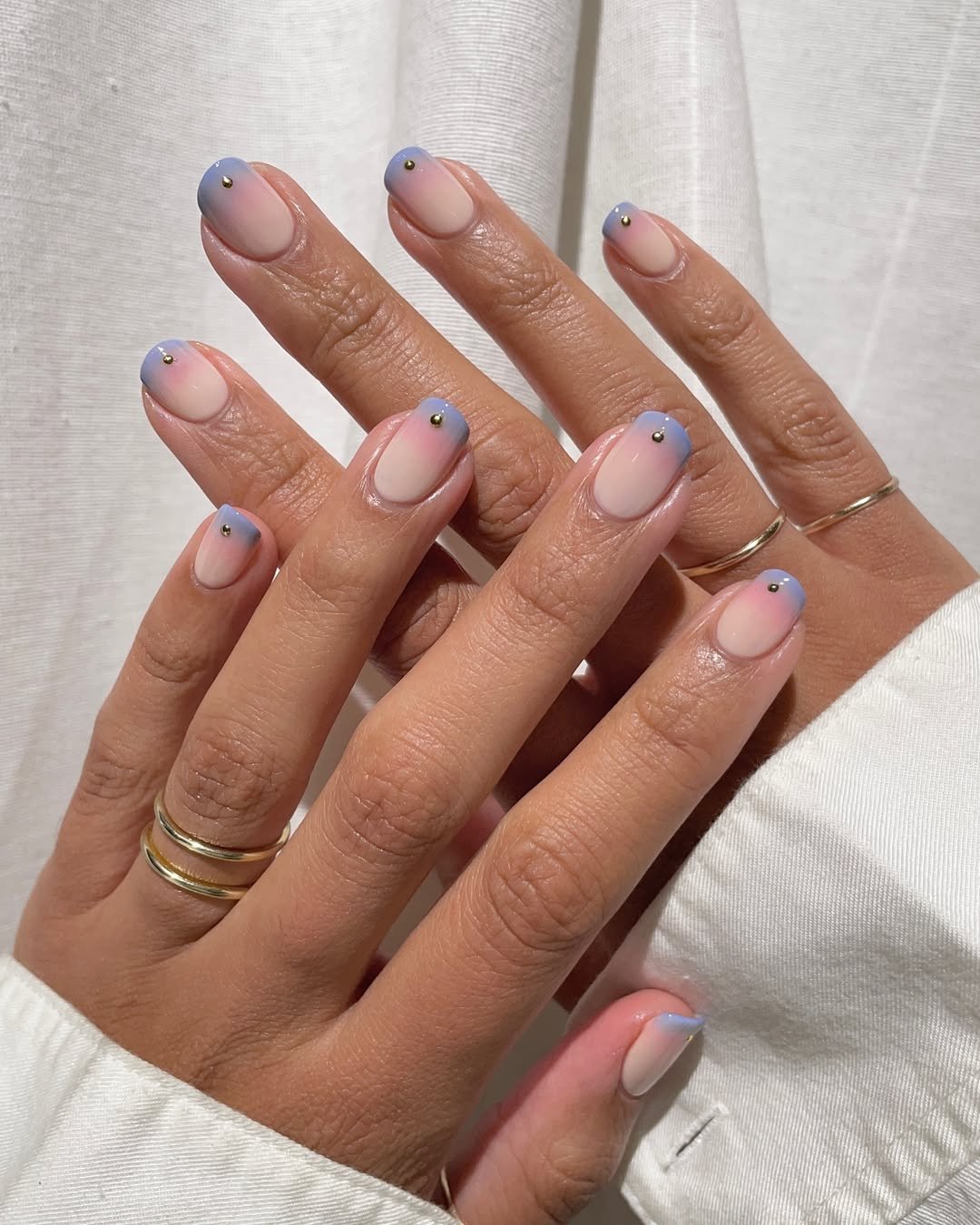 The gentle transition from a nude base to a cool lavender at the tips, highlighted by strategically placed tiny gold studs, creates a dreamy yet sophisticated look. The design is minimal but intentionally crafted.