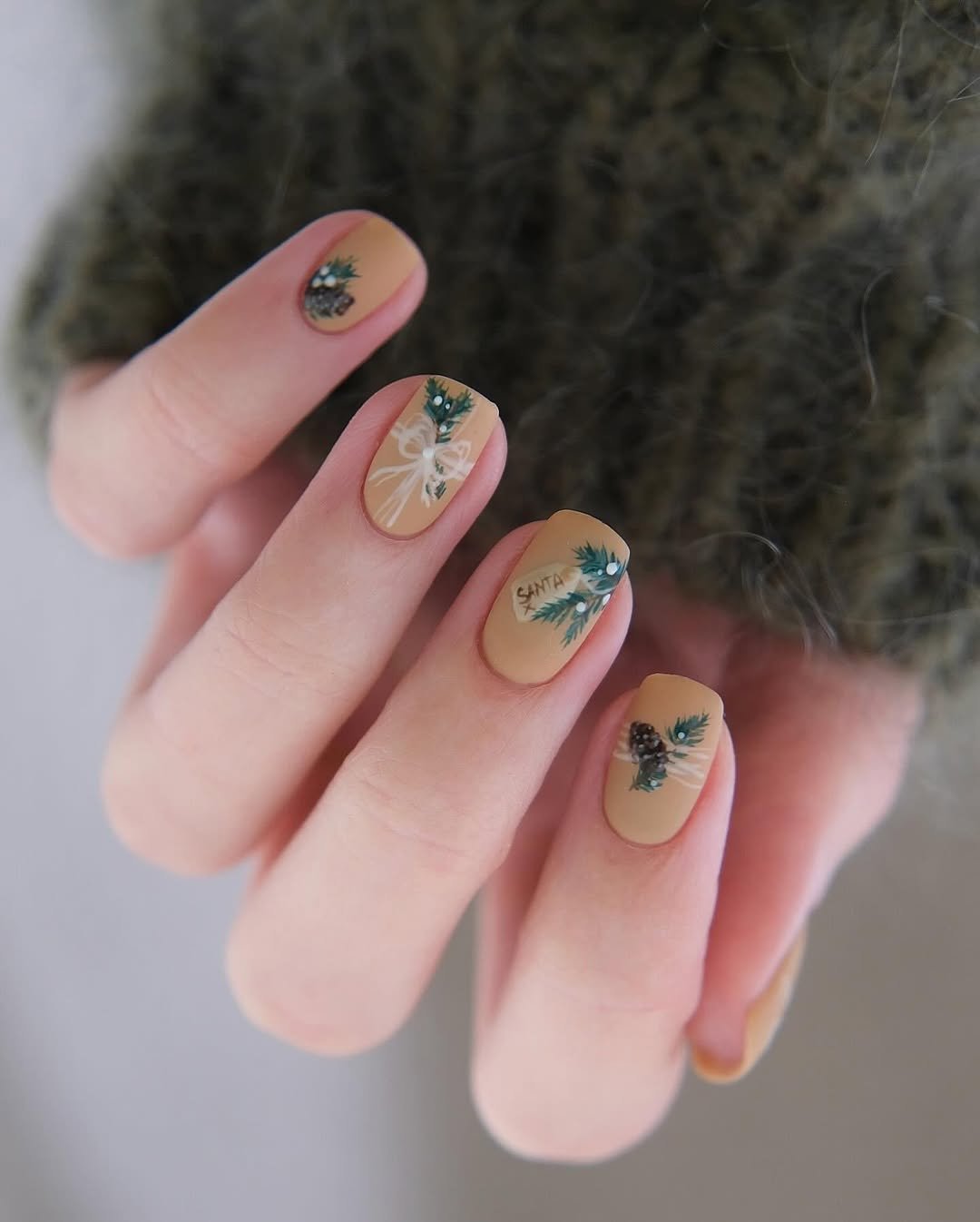 A creamy nude base serves as the canvas for delicate pine branch artwork and subtle embellishments. The design is intentionally light, ensuring it enhances rather than dominates the nail shape.