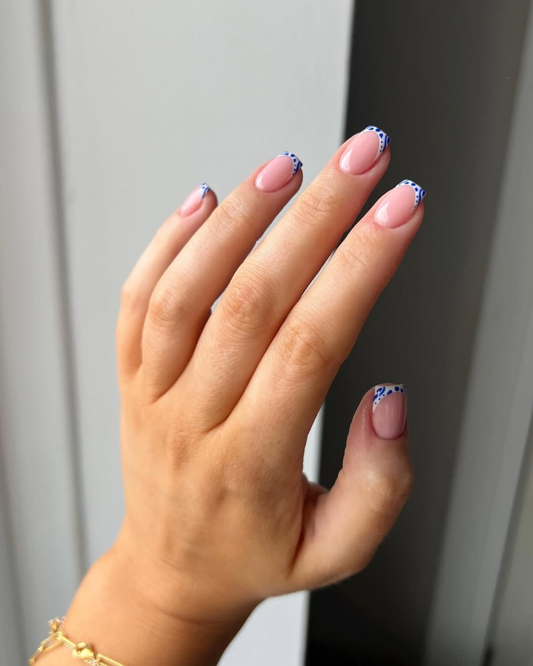 This design offers a playful take on minimalism. A sheer, light pink base is complemented by delicate dots of soft blue at the tips, maintaining a clean look with an engaging touch. It’s subtle enough for daily wear yet striking enough to feel intentionally styled.