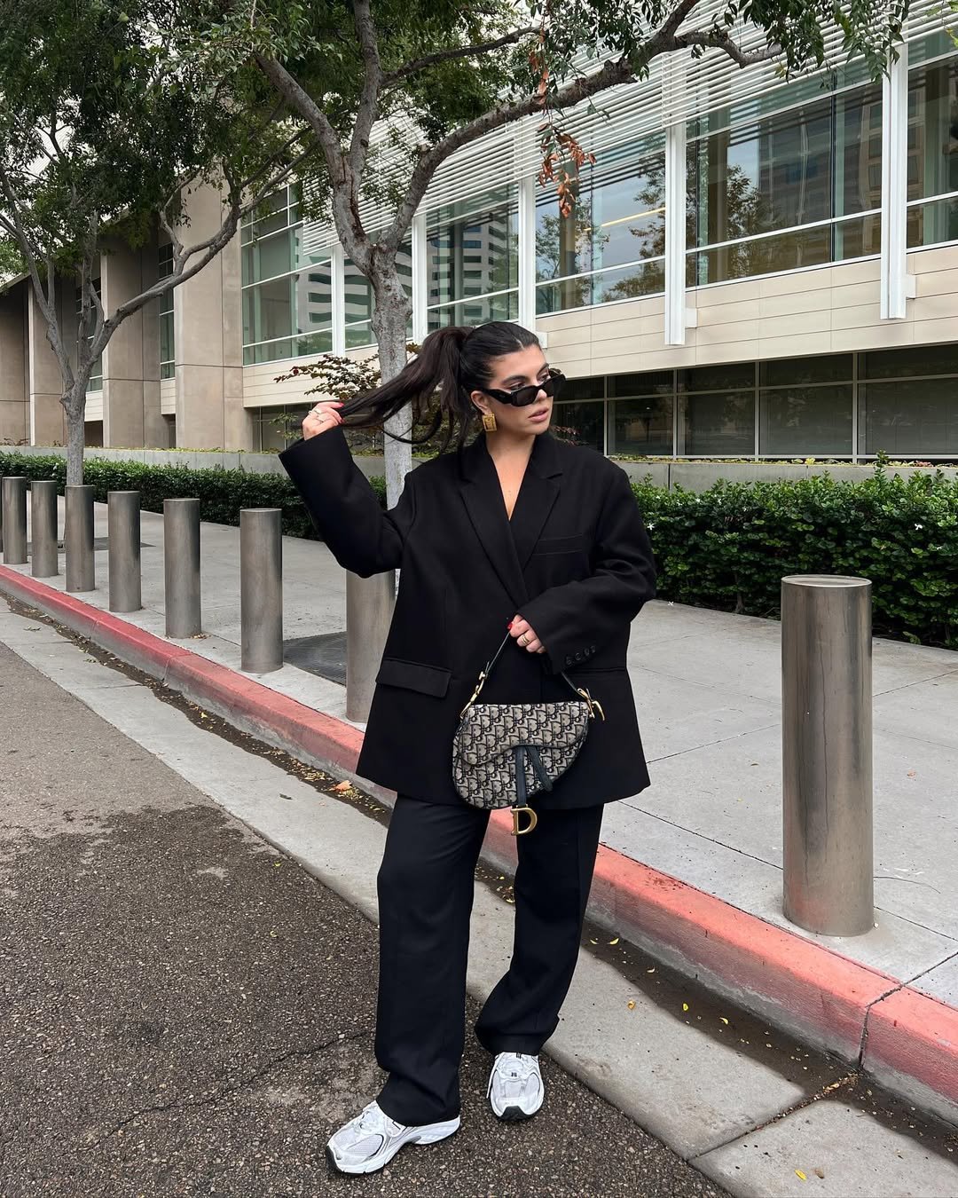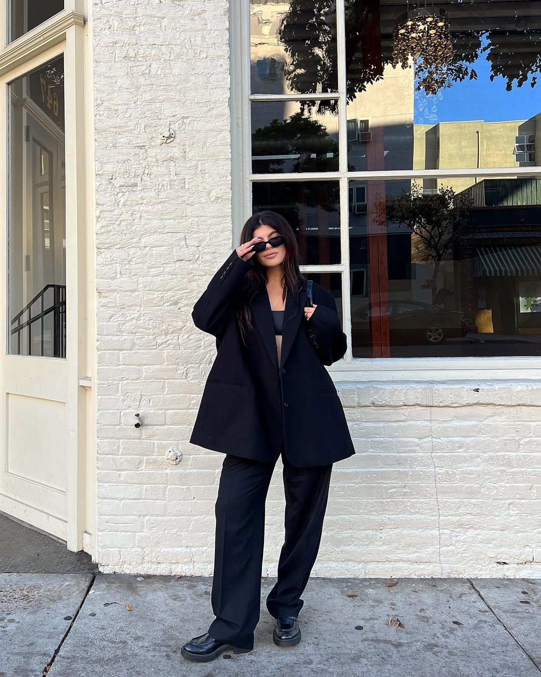 This all-black oversized fit epitomizes understated confidence. The blazer and trousers combination projects a strong, structured image, while the sneakers keep it grounded and practical.