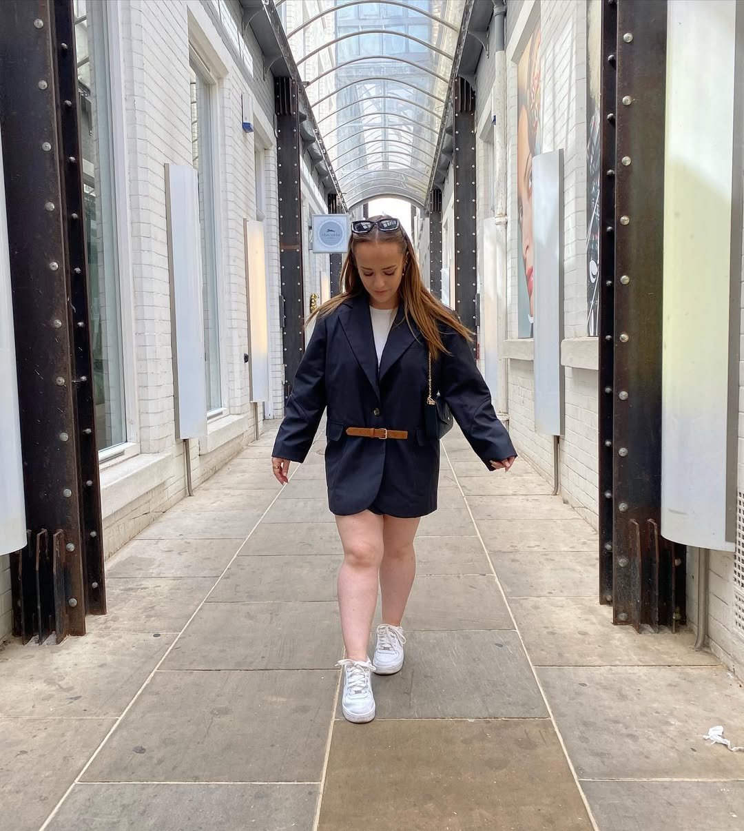Pairing a blazer with a mini skirt and sneakers is always a winning strategy. This outfit expertly plays with proportions, featuring an oversized top balanced by a fitted base, all grounded by simple white sneakers.