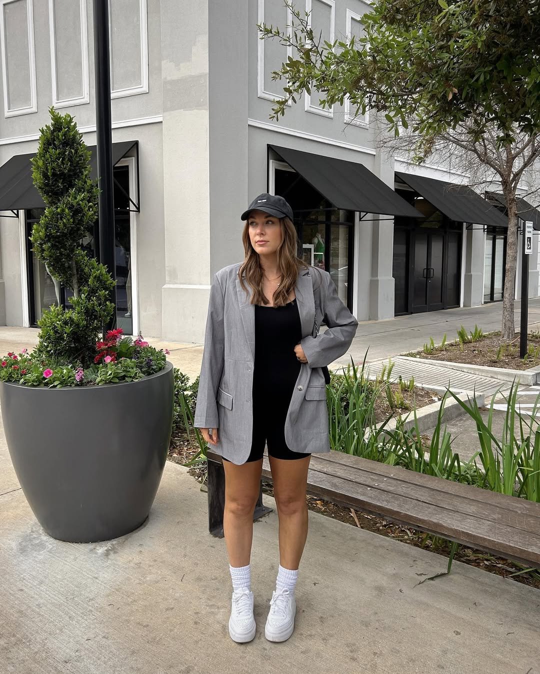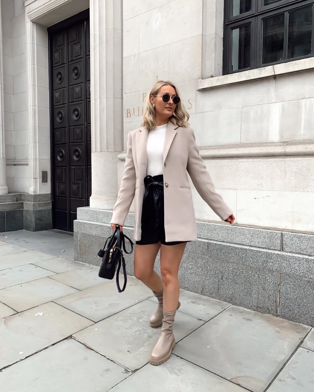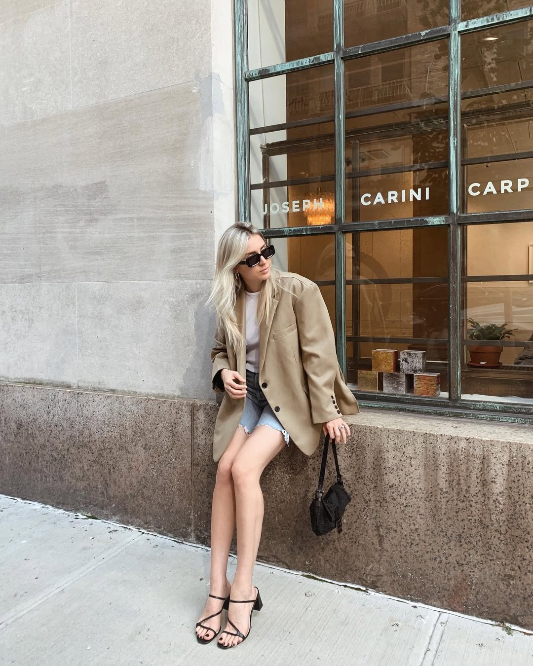 This soft beige blazer offers a wonderfully satisfying aesthetic. Paired with a white top and black shorts, it strikes an excellent balance between tailored structure and relaxed ease.