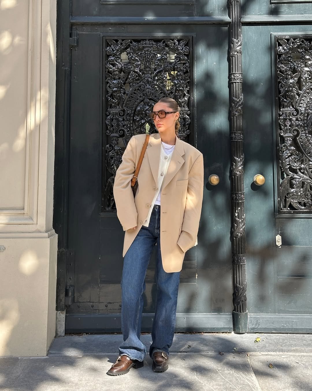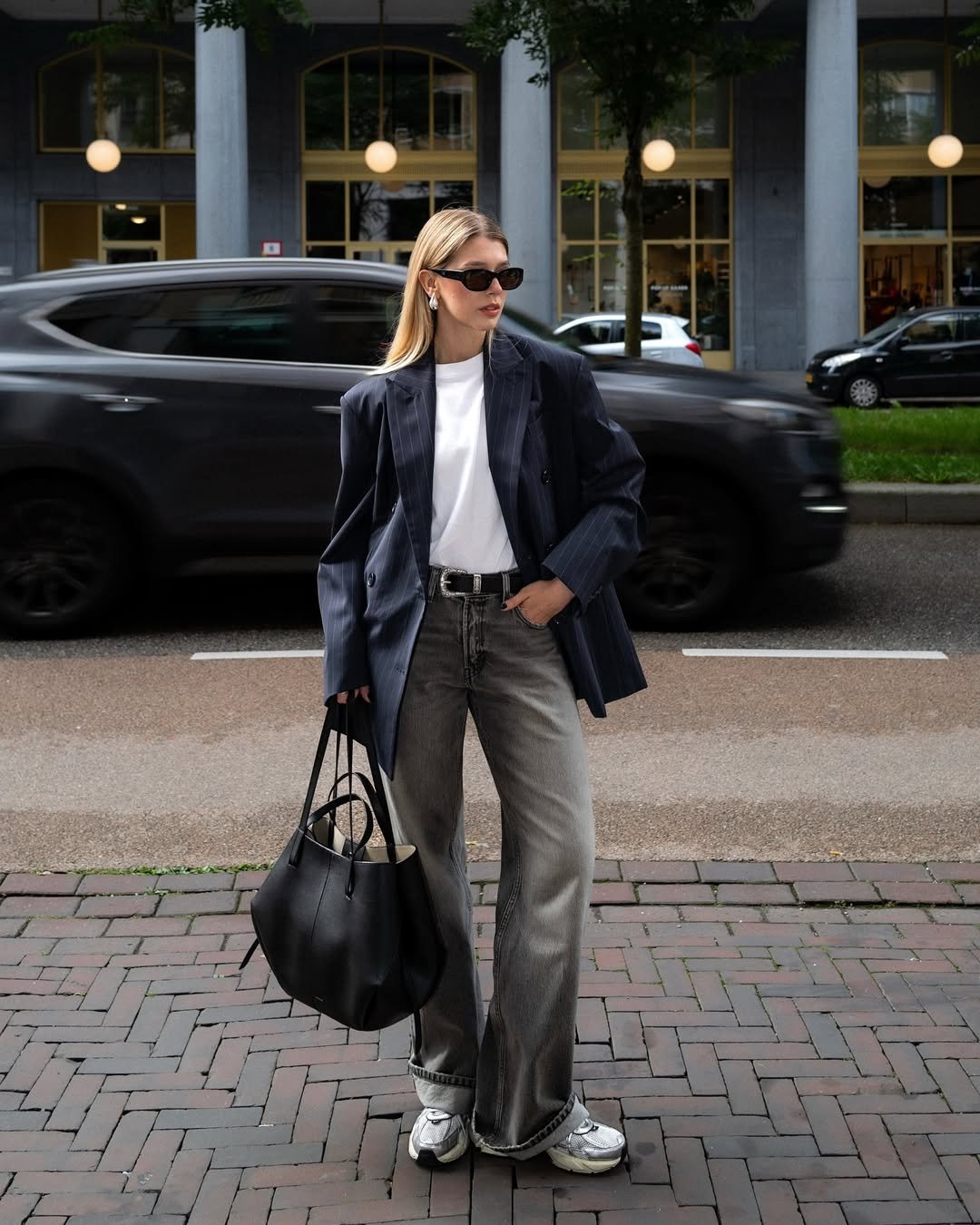 A blazer and denim combination is always a reliable choice, and this interpretation excels. The oversized blazer layered over a simple tee and wide-leg jeans offers that relaxed, street-style aesthetic.