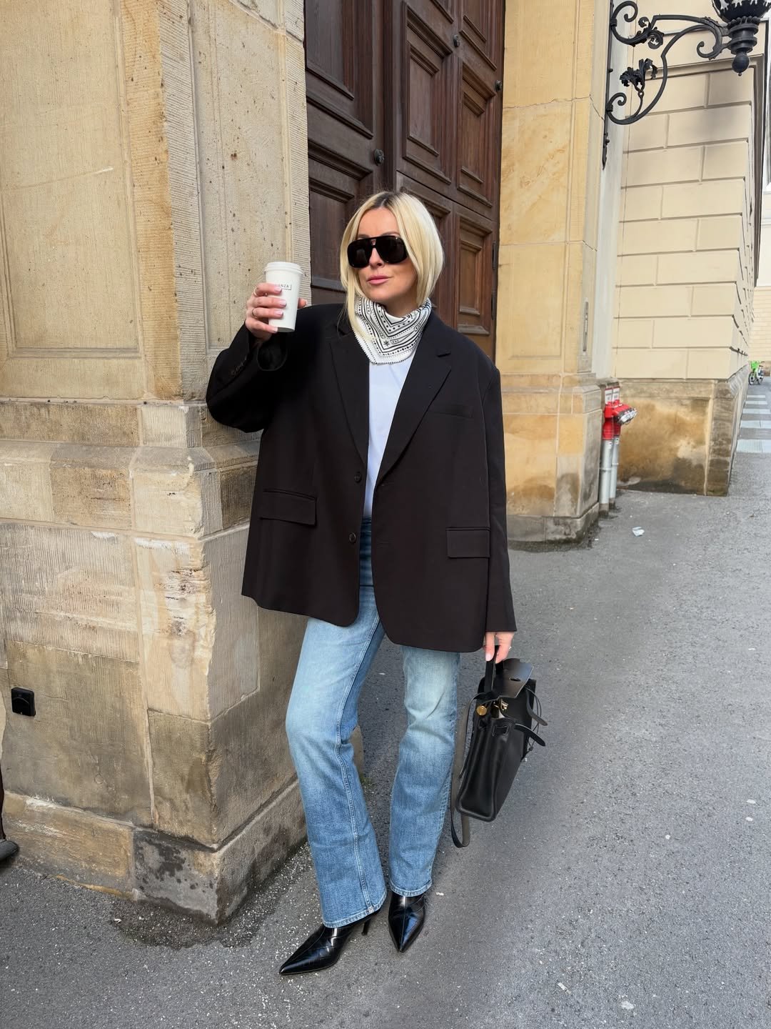 This outfit offers a stylish take on a leisurely morning. The oversized blazer paired with denim, sleek heels, and a scarf detail provides a relaxed yet refined vibe.