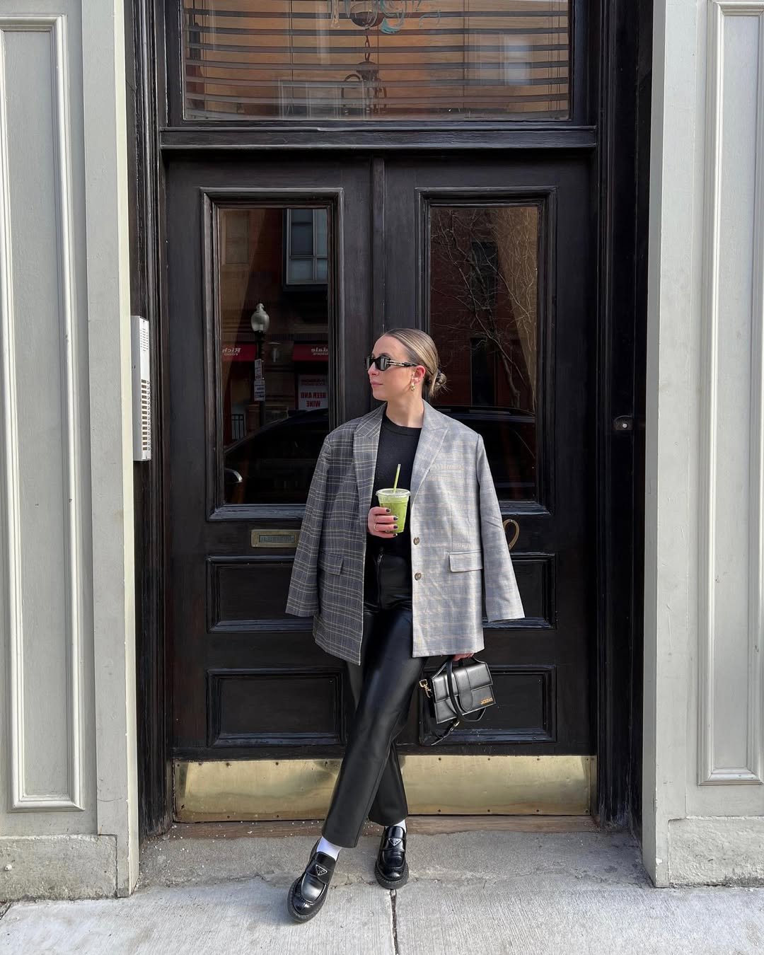 This outfit captures a complete mood. The oversized plaid blazer worn over a monochrome base, paired with loafers and a coffee in hand, presents a casually styled yet intentionally curated look.
