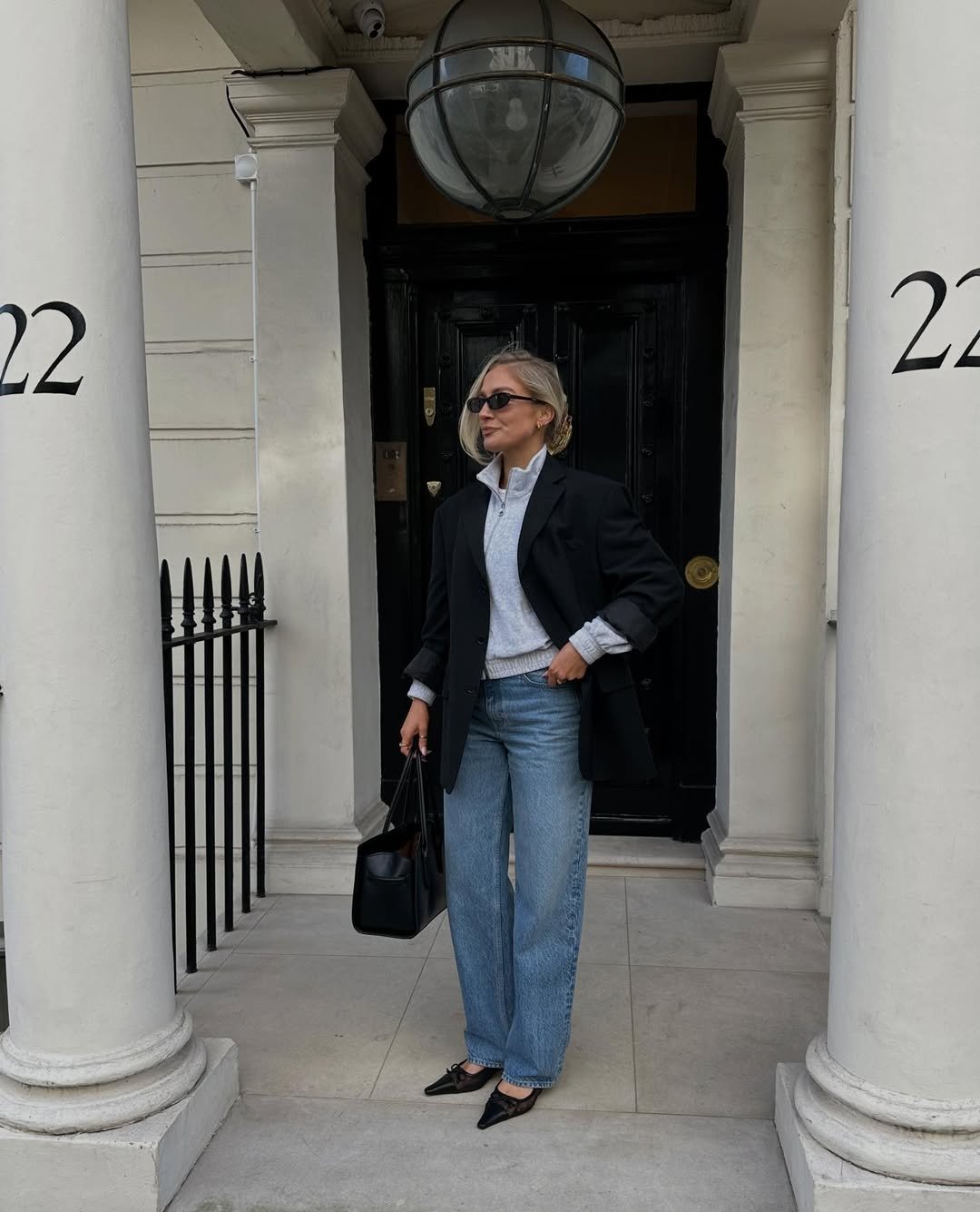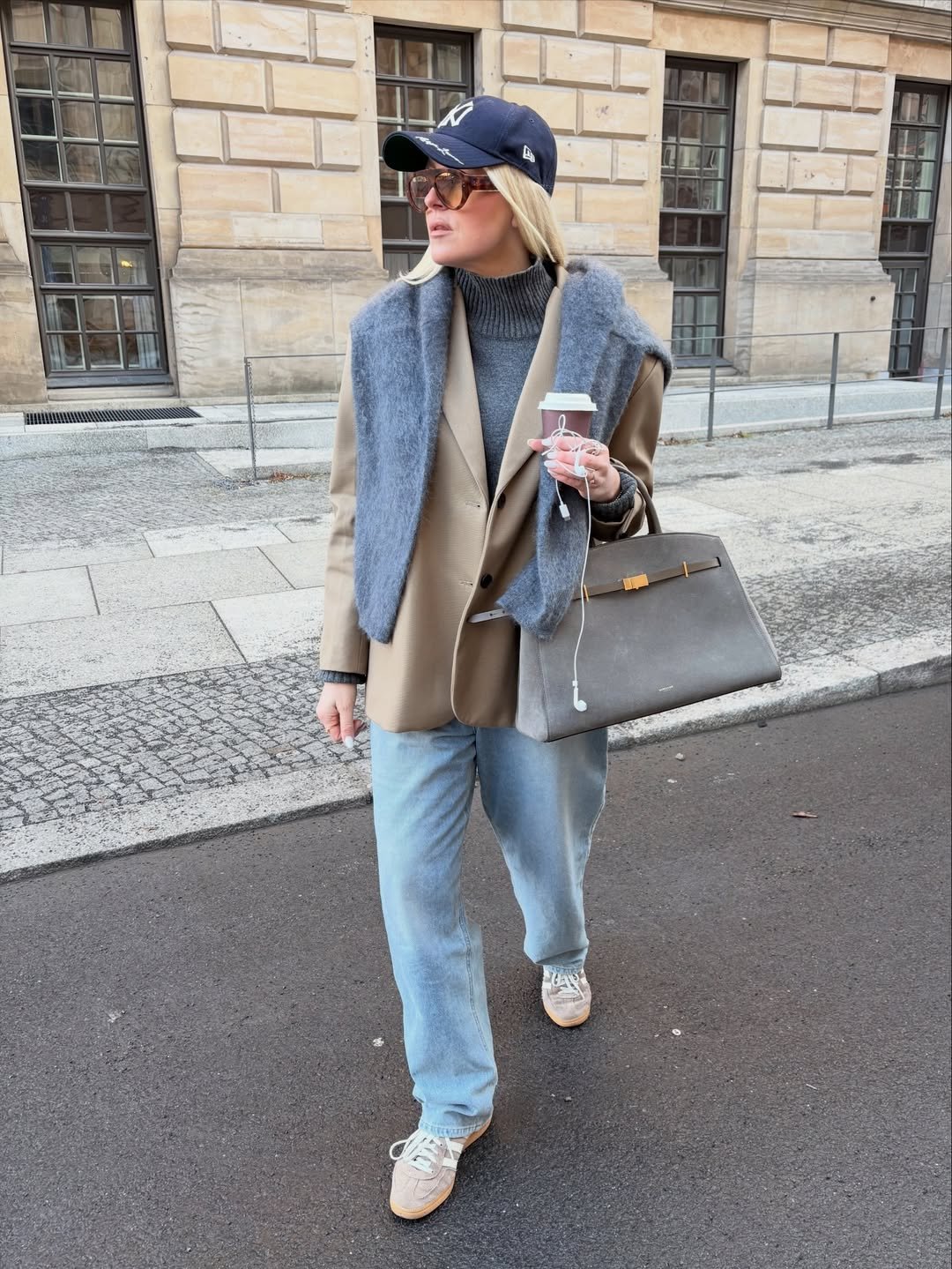 This look embraces comfortable layering while maintaining an elevated aesthetic. The oversized blazer, combined with knitwear and denim, creates a warm, snug feel without sacrificing chicness.