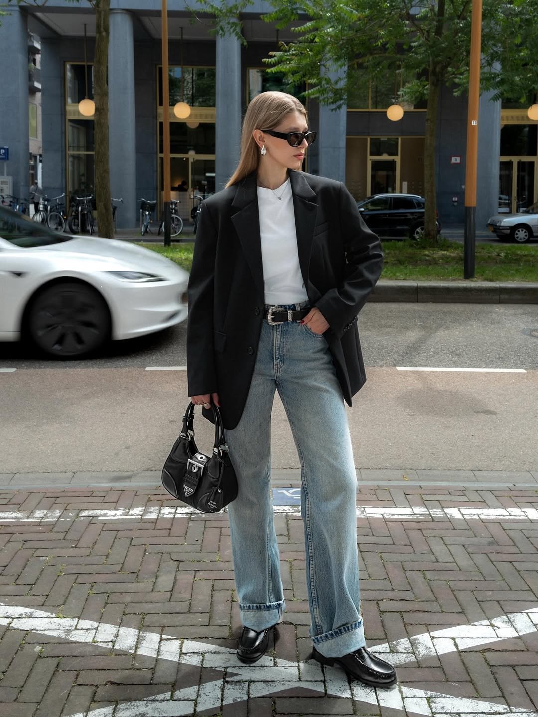 This classic combination—an oversized black blazer, a white tee, and loose denim—is timeless. The proportions are key to achieving that effortless street-style feel.