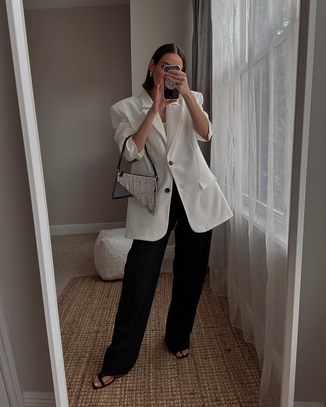 A white blazer adds a distinct flair to any outfit. Paired with black trousers, this combination is sharp, clean, and effortlessly sophisticated without appearing overly formal.