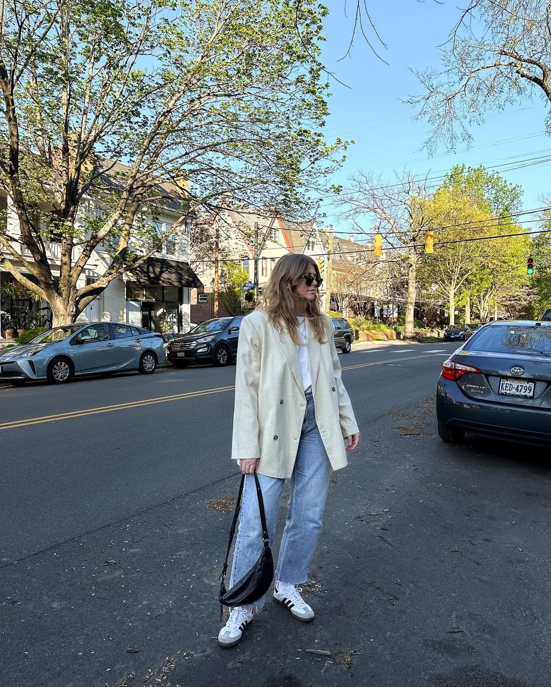 This outfit embraces an easy, everyday aesthetic. The light blazer worn over denim feels relaxed, familiar, and highly suitable for any casual occasion.
