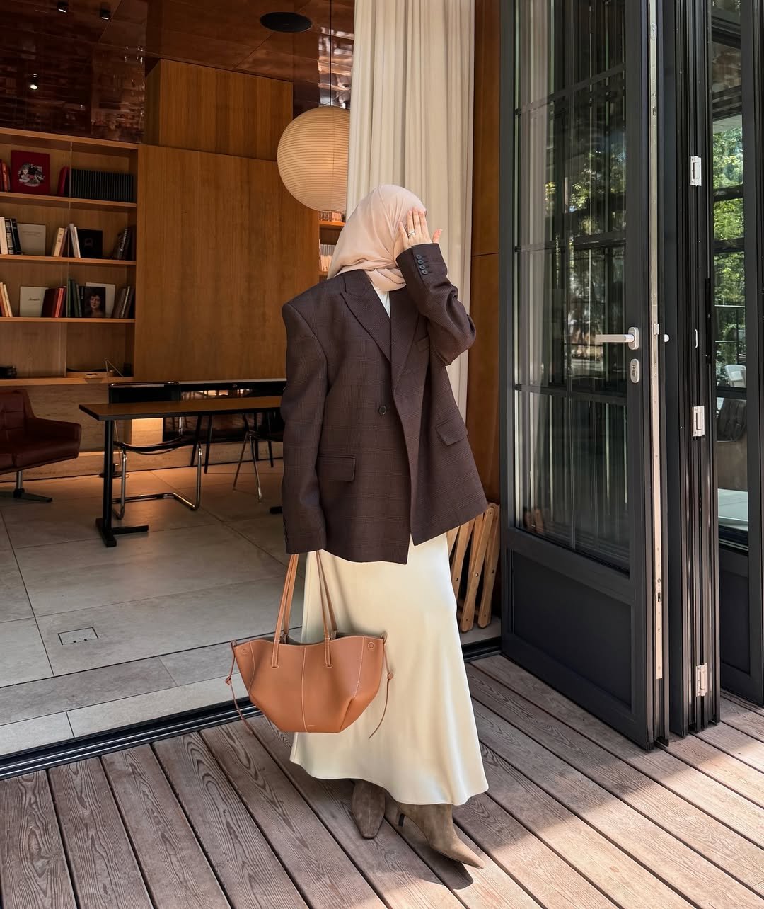 This look seamlessly integrates modest fashion into a contemporary, tailored aesthetic. The oversized blazer layered over a flowing dress creates a beautiful contrast between structure and fluidity.