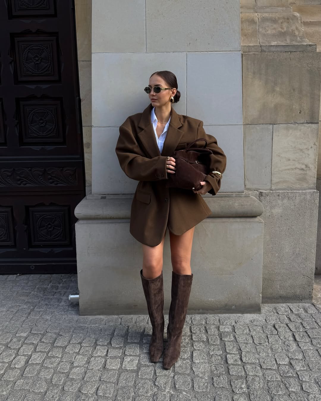 This oversized brown blazer makes a bold yet wearable statement. Styled as a mini with knee-high boots, it provides a strong silhouette while maintaining a sleek and feminine appearance.