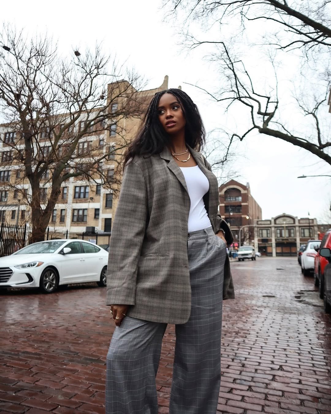 This ensemble fully embraces power dressing with a contemporary interpretation. The plaid blazer and matching wide-leg trousers convey a bold, structured, and highly confident aesthetic.
