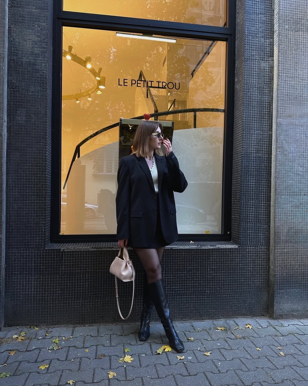 This look is sharp, clean, and subtly daring. Styling an oversized black blazer as a mini dress, complemented by knee-high boots, creates an ideal high-low contrast – structured on top and sleekly leggy below.