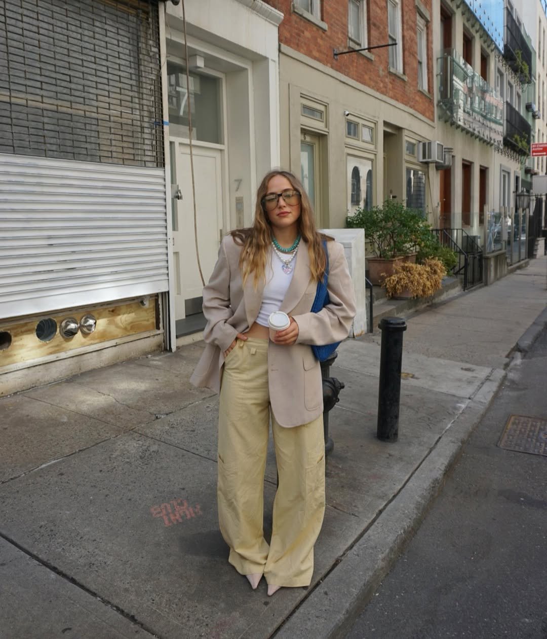 Chunky sneakers and an oversized tote bag add practicality and keep the look grounded. It’s relaxed, slightly oversized, and embodies the essence of “effortlessly cool.”