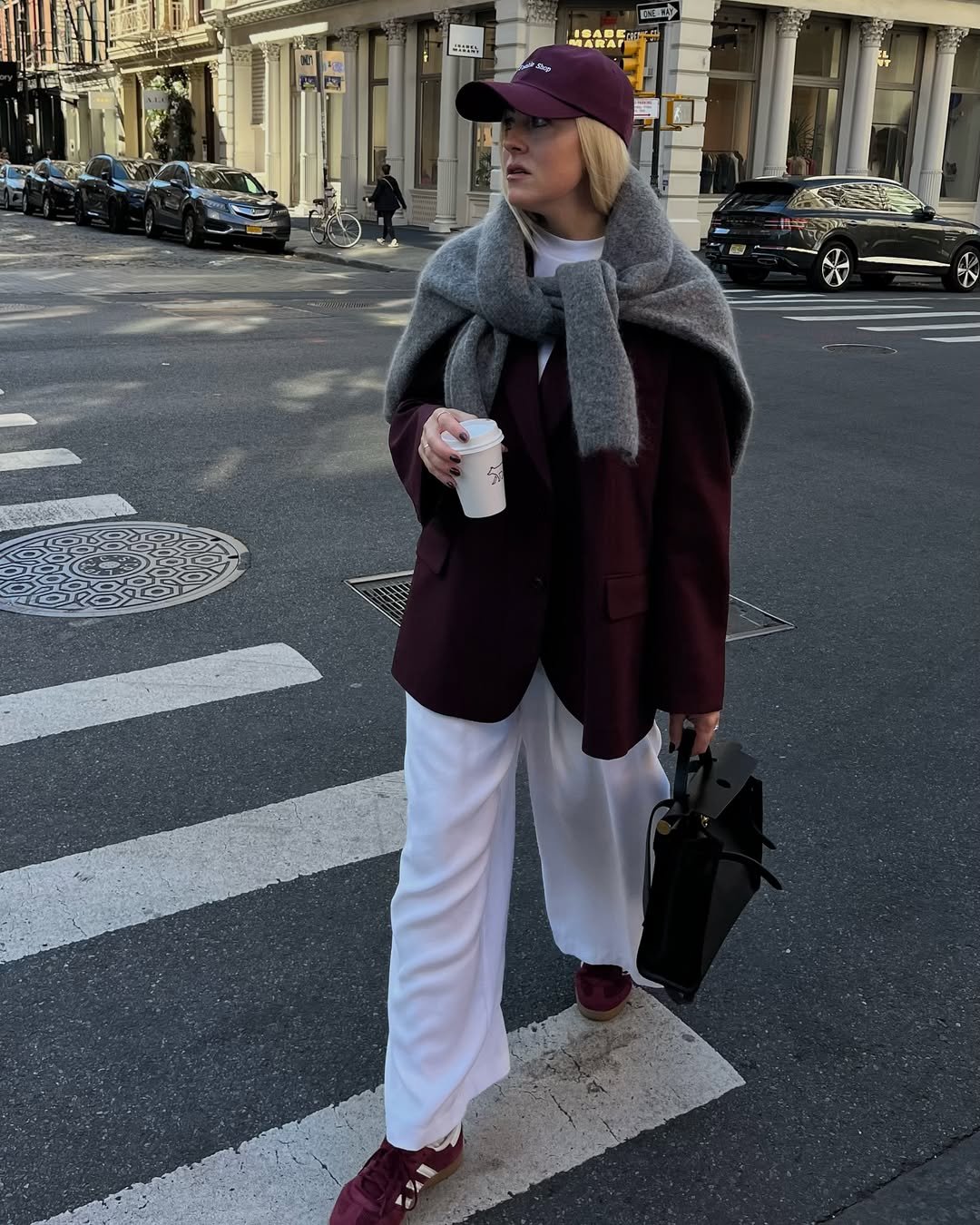 This look evokes a crisp autumn morning in the city—complete with coffee, an oversized blazer, and thoughtful layering. The rich burgundy tones paired with crisp white trousers create a striking, balanced contrast.