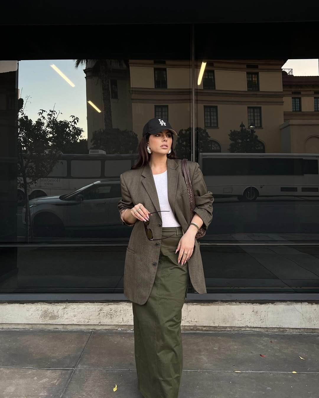 This ensemble fully embraces a strong, structured silhouette. The oversized blazer paired with sleek, darker tones projects a powerful, confident image with a fashion-forward sensibility.