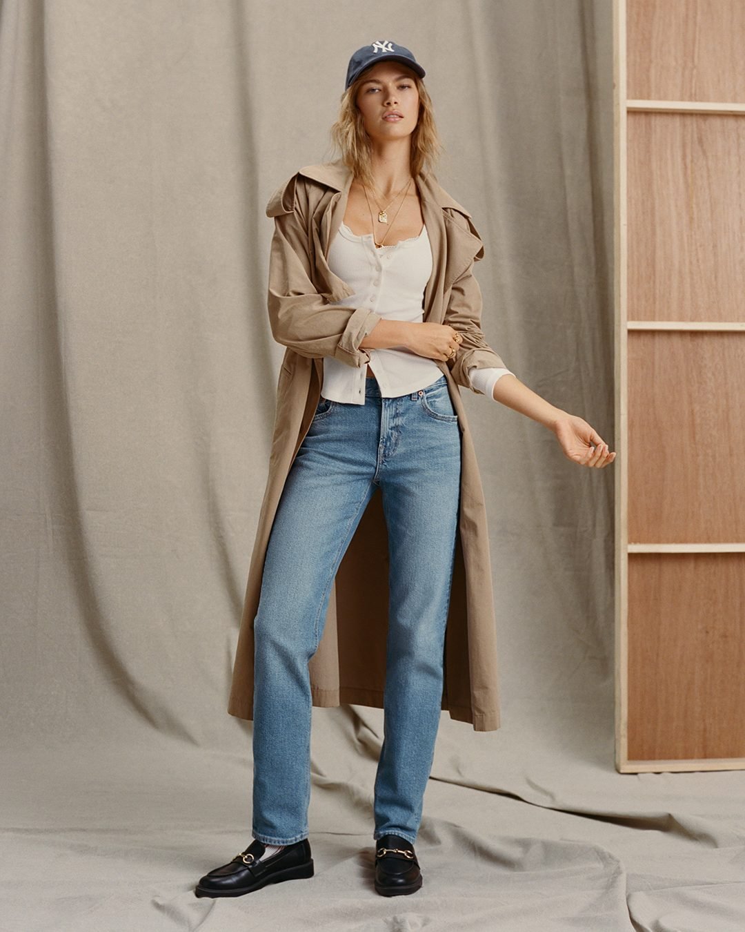 This outfit embodies a timeless, effortless cool. A relaxed trench coat layered over a simple white tank creates a clean, city-ready aesthetic that remains eternally stylish. Straight leg jeans complete the polished look.