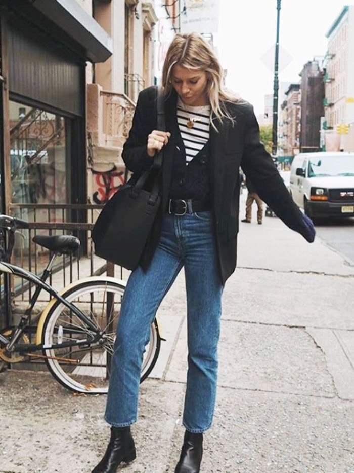 The combination of a striped top and straight leg denim offers a timeless appeal. Adding a relaxed cardigan and a structured blazer creates a sophisticated, city-ready ensemble.