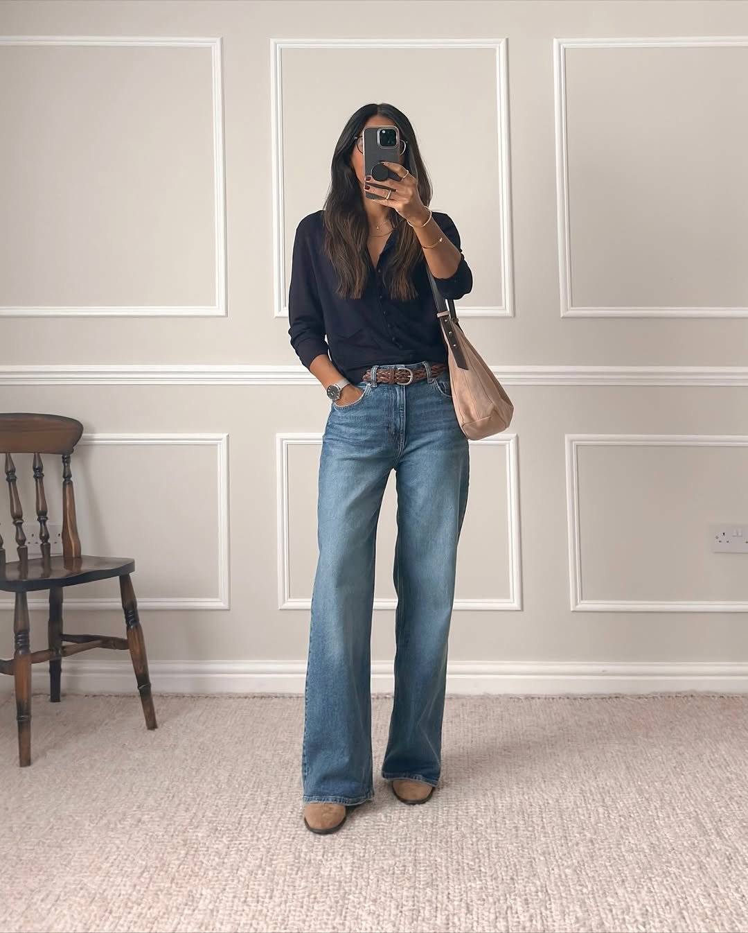 A black blouse paired with classic denim offers a consistently stylish option. Tucking in the shirt creates a flattering shape, while a simple belt adds a subtle detail that makes the outfit feel deliberate.