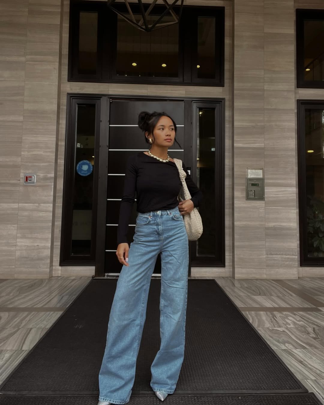 For those who appreciate simple yet stylish outfits, this look is a perfect example. A fitted black long-sleeve top paired with light-wash straight leg jeans establishes a clean, balanced, and flattering silhouette.