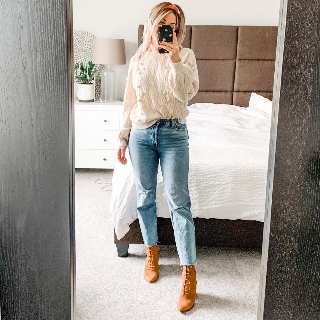 The combination of a chunky knit sweater and classic denim offers a sense of comfort. The textured cream sweater provides warmth and softness, making it an ideal choice for cooler mornings or relaxed weekend activities.
