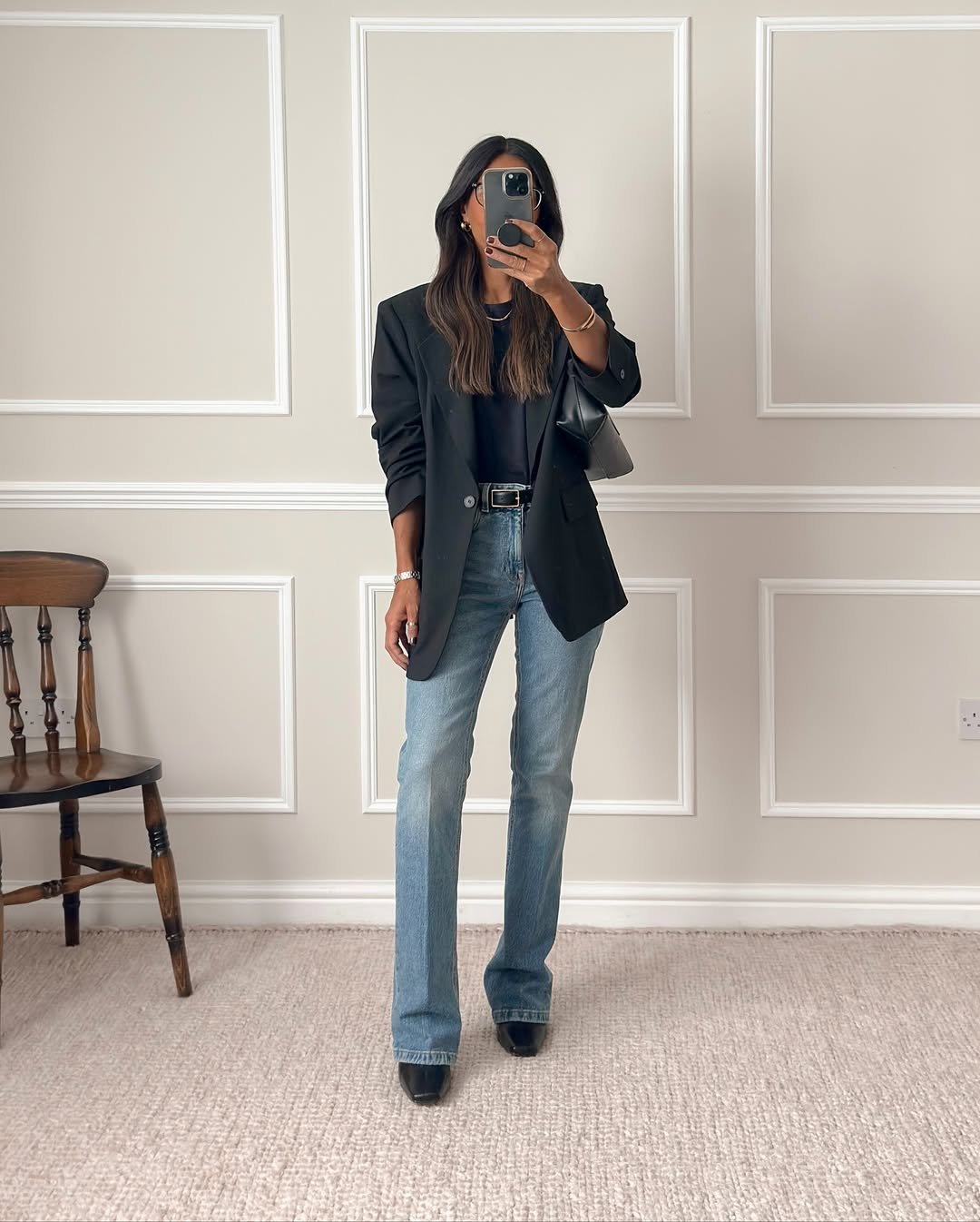 Blazers and denim are a consistently winning combination, and this outfit highlights why. A warm neutral blazer layered over a black blouse instantly elevates simple straight leg jeans.