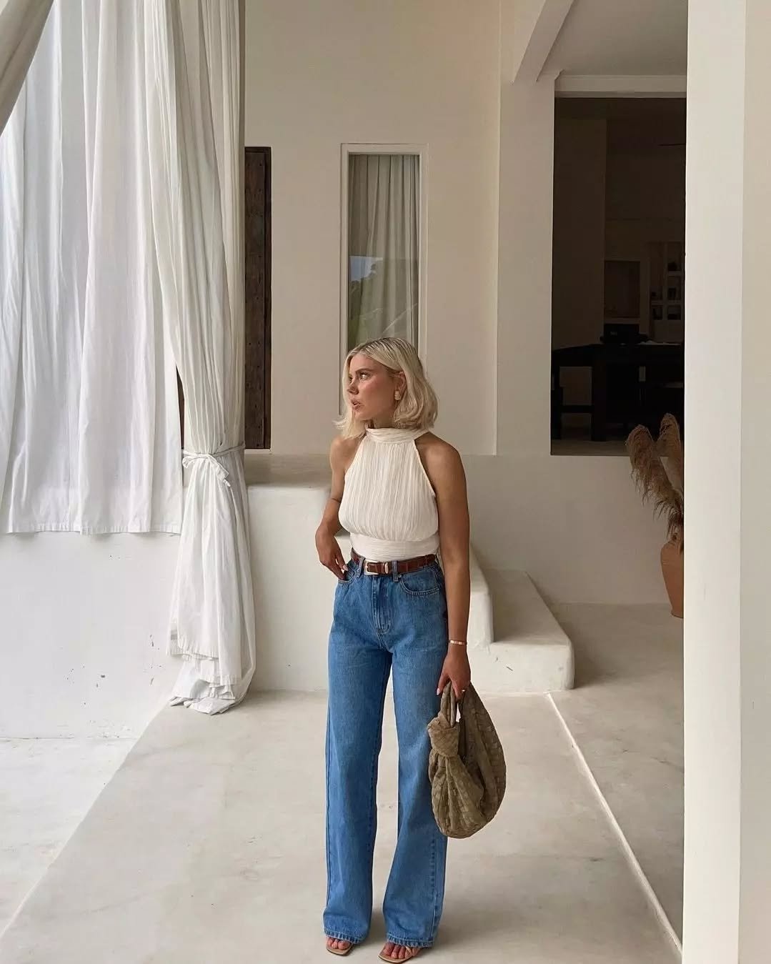 This outfit evokes a sense of relaxed summer leisure. A soft, draped halter top paired with straight leg jeans offers an airy, refined aesthetic that feels polished without appearing contrived. A simple leather belt adds definition.