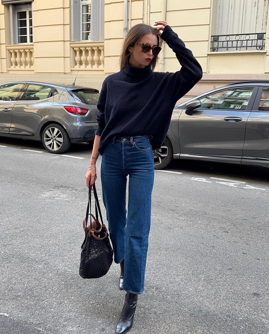 Channeling Parisian street style, this look features a soft black turtleneck tucked into dark straight leg jeans, resulting in a sleek yet comfortable silhouette. Its understated nature is precisely what makes it so effective.