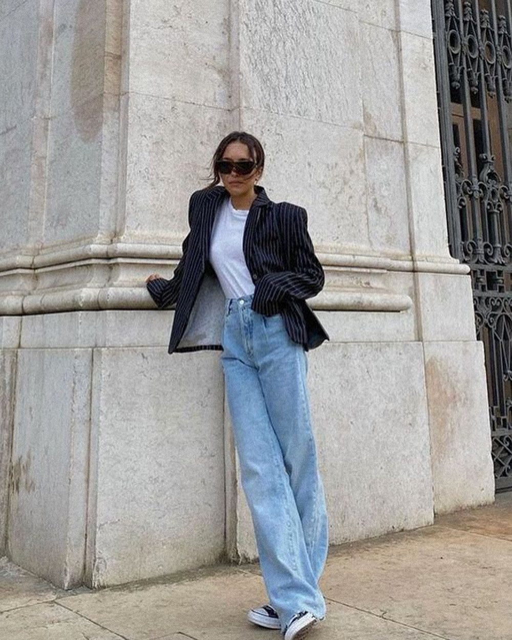 A tailored pinstripe blazer instantly elevates a simple outfit. Here, it’s paired with a crisp white t-shirt and loose light-wash jeans, creating an effective contrast between structured and relaxed elements.