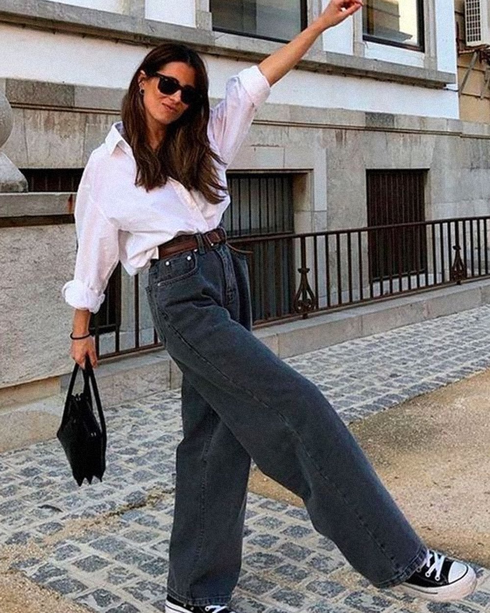 A belt adds subtle structure, while Converse sneakers keep the outfit feeling light and youthful. This is an ideal weekend uniform for exploring charming streets or enjoying spontaneous coffee meetups.